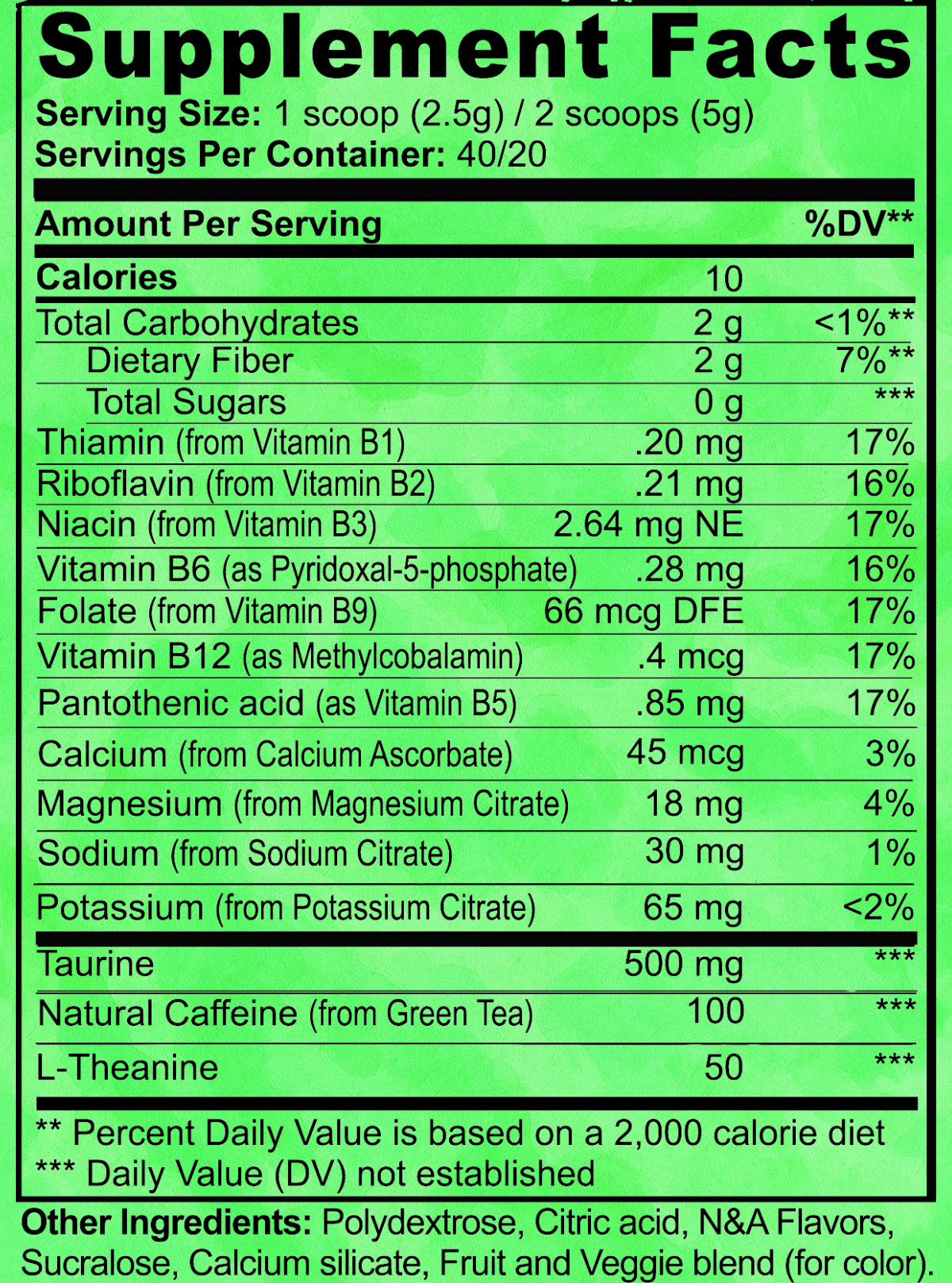 Thiamin (from Vitamin B1), Riboflavin (from Vitamin B2), Niacin (from Vitamin B3), Vitamin B6 (as Pyridoxal-5-phosphate), Folate (from Vitamin B9), Vitamin B12 (as Methylcobalamin), Pantothenic acid (from Vitamin B5), Calcium (from Calcium Ascorbate), Magnesium (from Magnesium Citrate), Sodium (from Sodium Citrate), Potassium (from Potassium Citrate), Taurine, Natural Caffeine (From Green Tea), L-theanine, Polydextrose, Citric acid, N&A Flavors, Sucralose, Calcium silicate, Fruit and Veggie blend (for color).